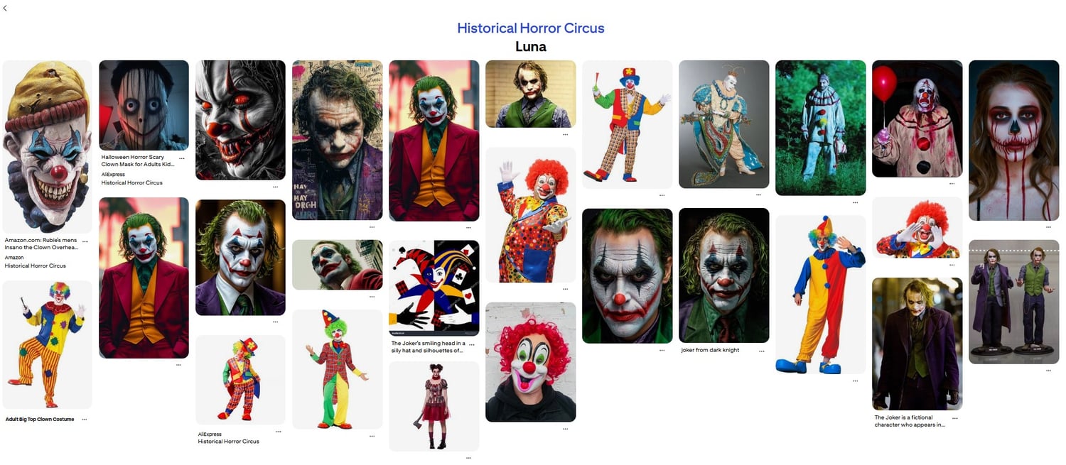 These were our characters: Ringmaster, Clown, Tightrope, Fire juggler, Strongman (Strongwoman), Magician, Trapeze, Contortionist, Ventriloquist, Conjoined twins. To be honest, I didn't even know all the character names, so I used the dictionary a lot!😆 And here is my group's Pinterest link Historical Horror Circus (Group 3). And this is my link Historical Horror Circus (Lune).